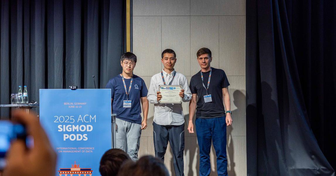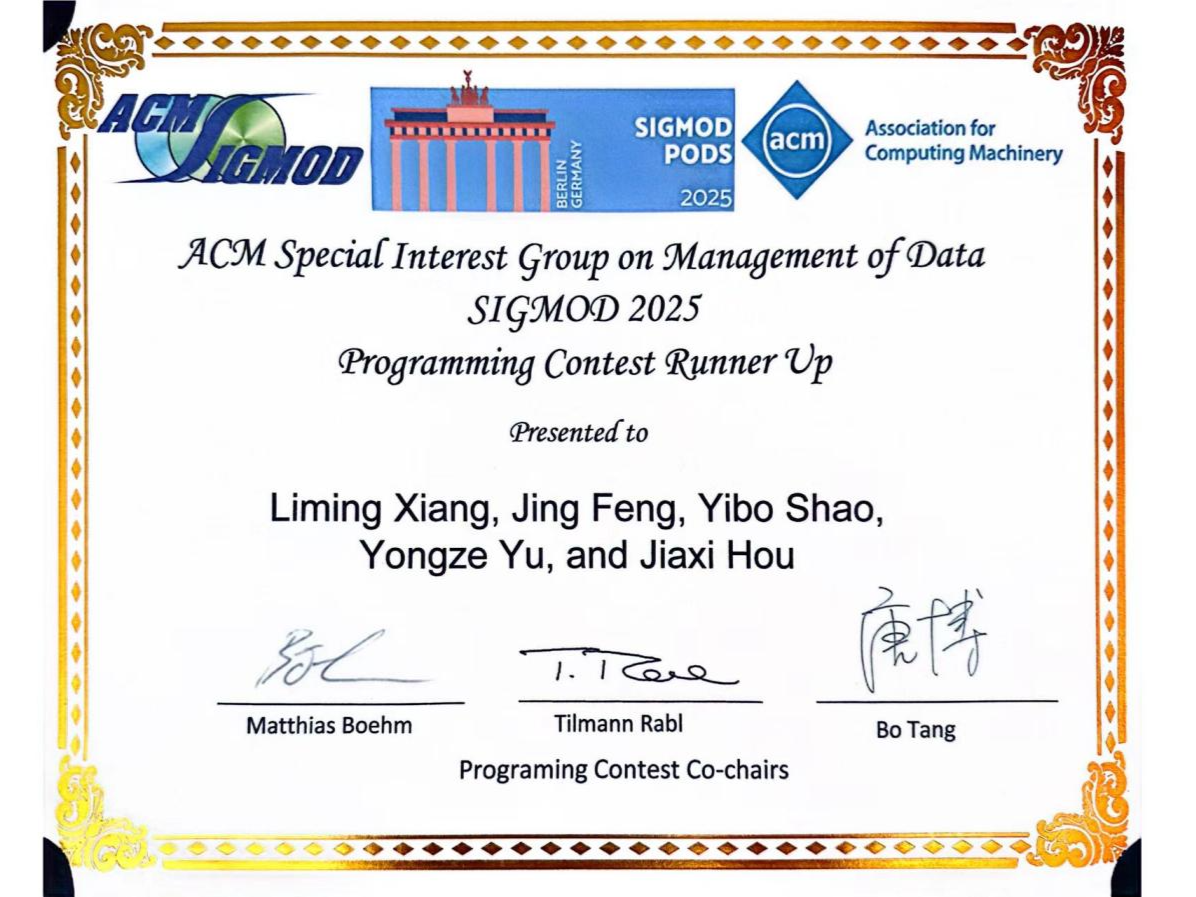 2025年6月,数据库领域全球顶级学术会议SIGMOD 2025在德国柏林落幕。经过激烈角逐,北理工金年会jinnianhuicom硕士研究生项黎明、封璟,本科生邵艺博、侯佳希以及来自西安电子科技大学的俞泳泽组成的Kirara队在秦宏超、李荣华、王国仁老师的指导下,获得了编程竞赛全球亚军(Programming Contest Runner Up Award),这是北理工学子首次参加该赛事。本次竞赛冠军由慕尼黑工业大学(TUM)团队夺得,清华大学团队位列第三。