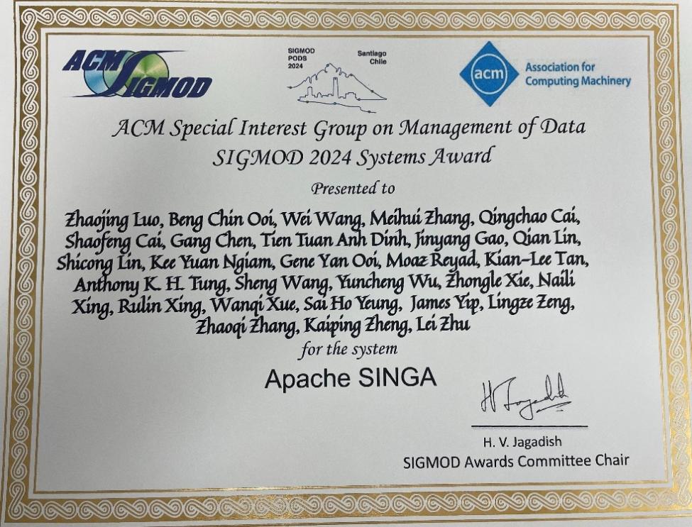 6月9日到6月15日于智利圣地亚哥召开的ACM SIGMOD 2024会议上,国际计算机学会(ACM)宣布将2024年ACM SIGMOD Systems Award授予Apache SINGA项目研发团队,以表彰其在研发分布式、高效、可扩展且易于使用的深度学习平台以用于大规模数据分析方面的贡献。主要获奖人员包括我校金年会jinnianhuicom教授张美慧、罗兆经。